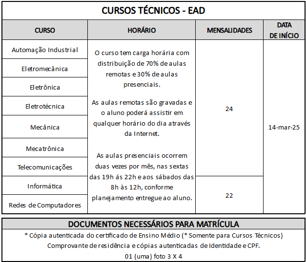 Obs.: As cargas horárias dos cursos técnicos obedecem a determinação do MEC constante no catálogo nacional de cursos técnicos.