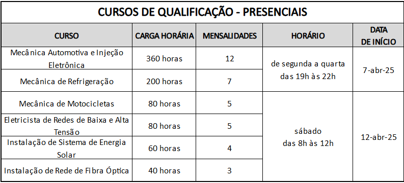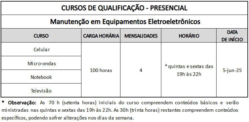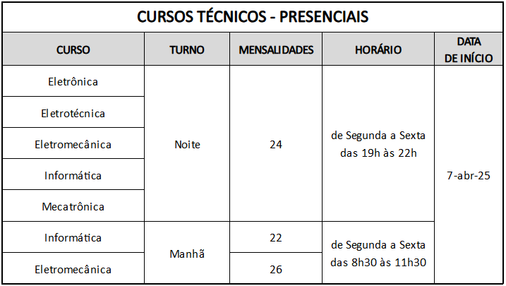 Obs.: As cargas horárias dos cursos técnicos obedecem a determinação do MEC constante no catálogo nacional de cursos técnicos.